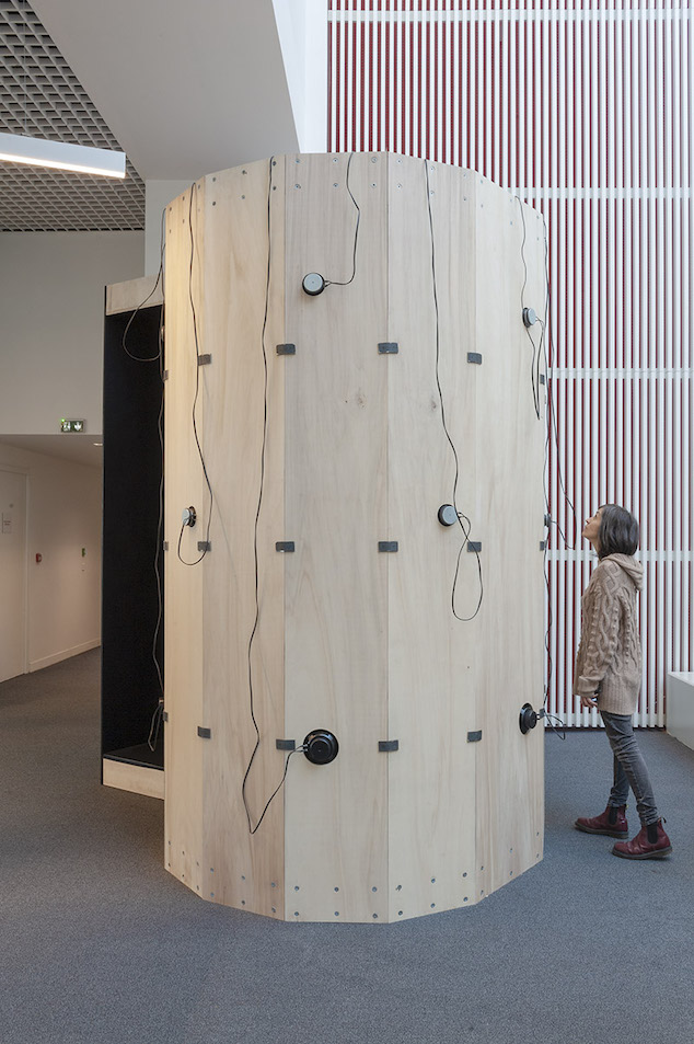 « Dans cette installation mêlant sculpture, technologie et son, j’ai cherché à raviver l’émerveillement pour des phénomènes cachés dans les sols et qui sont pourtant constitutifs de notre environnement. Par un dialogue art et science, j’ai également voulu explorer la vie qui réside dans la terre et sous nos pieds pour donner à voir et à entendre les émissions sonores des organismes vivants, révélateurs quasi-invisibles de la pollution des écosystèmes urbains dans lesquels nous évoluons. Que trouverait-on si on explorait le sol sous nos pieds ? Y trouverait-on un dernier espace libre de perturbations sonores anthropiques ? Y entendrait-on le chant d’un ver de terre, dernière oeuvre remarquable d’une planète en danger ? »