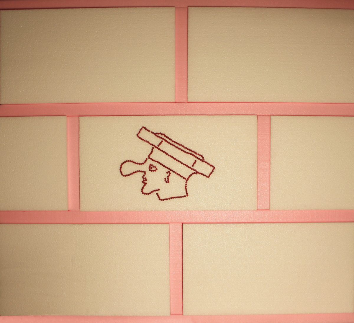 Ici les gravures représentées sur un faux mur de brique en suspension se composent en trois catégories : celles qui ont perdu leur sens en raison de la difficulté à les déchiffrer et des effets du temps, celles qui trouvent un intérêt imprévu au regard des artistes, et celles qui perdurent dans les esprits, conservant leur signification, universelle, par delà les siècles.