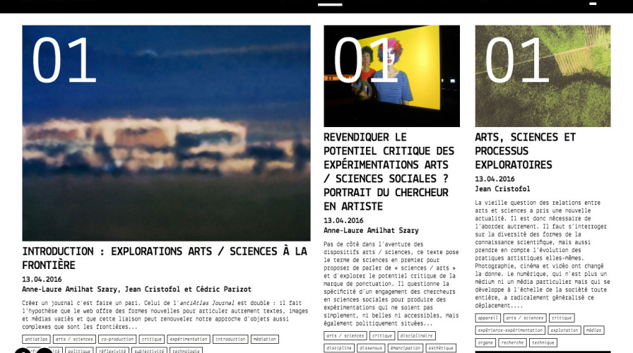 Revue numérique annuelle, bilingue et gratuite, antiAtlas Journal ouvre un espace éditorial exploratoire dédié à une approche radicalement transdisciplinaire des frontières contemporaines. Prolongeant le projet antiAtlas des frontières, reposant sur une collaboration entre chercheurs et artistes, elle expérimente de nouvelles pratiques d’édition et de modélisation de la recherche. La revue est consultable sur le web (tous formats) et en PDF.