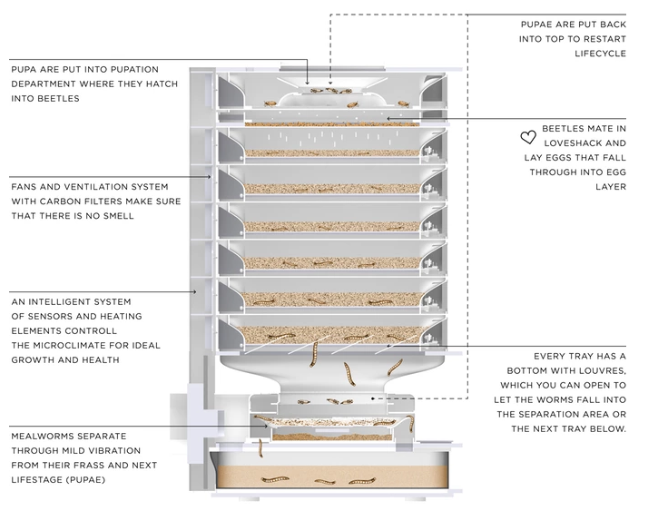 Mealworms are healthy and good for the planet! They combine the best of meat and plant-based proteins: with a similar protein content to red meats like beef and the beneficial amino-acid profile of tofu. They are also packed with vitamins and enzymes to keep you healthy. Our design-driven approach and innovative technology empowers you to produce your own food with an efficient, pleasant and clean process.