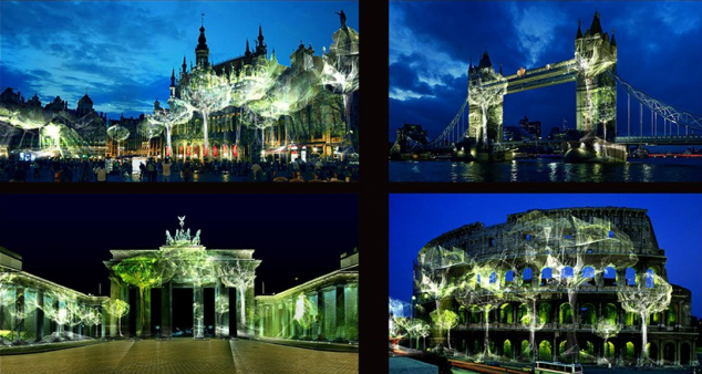 One Heart One Tree qui associe la présentation d’une oeuvre d’art numérique à une initiative de reforestation appartient à une nouvelle génération de projets. Ici le réel et le virtuel ne sont plus opposés mais associés au profit d’une véritable expérimentation. Le cœur de ce projet est d’utiliser les technologies pour reconnecter à la nature. C’est le battement de cœur de chaque spectateur qui donne naissance à un autre vivant, l’arbre, par le biais de technologies. Le projet fait partie d’un processus qui a démarré en 2012 sous la forme d’une installation physique interactive. Créée pour Rio+20, elle a depuis été présentée dans plusieurs contextes (Rio+20, Gaité lyrique, LH Forum, Techfest en Inde…) et liée à différents projets de reforestation dans le monde. Une seconde étape de cette réflexion est imaginée ici sous la forme d’une installation urbaine monumentale. Les deux niveaux sont pensés de manière complémentaires: une installation en intérieur pourrait être installée de manière permanente , l’installation monumentale est éphémère.